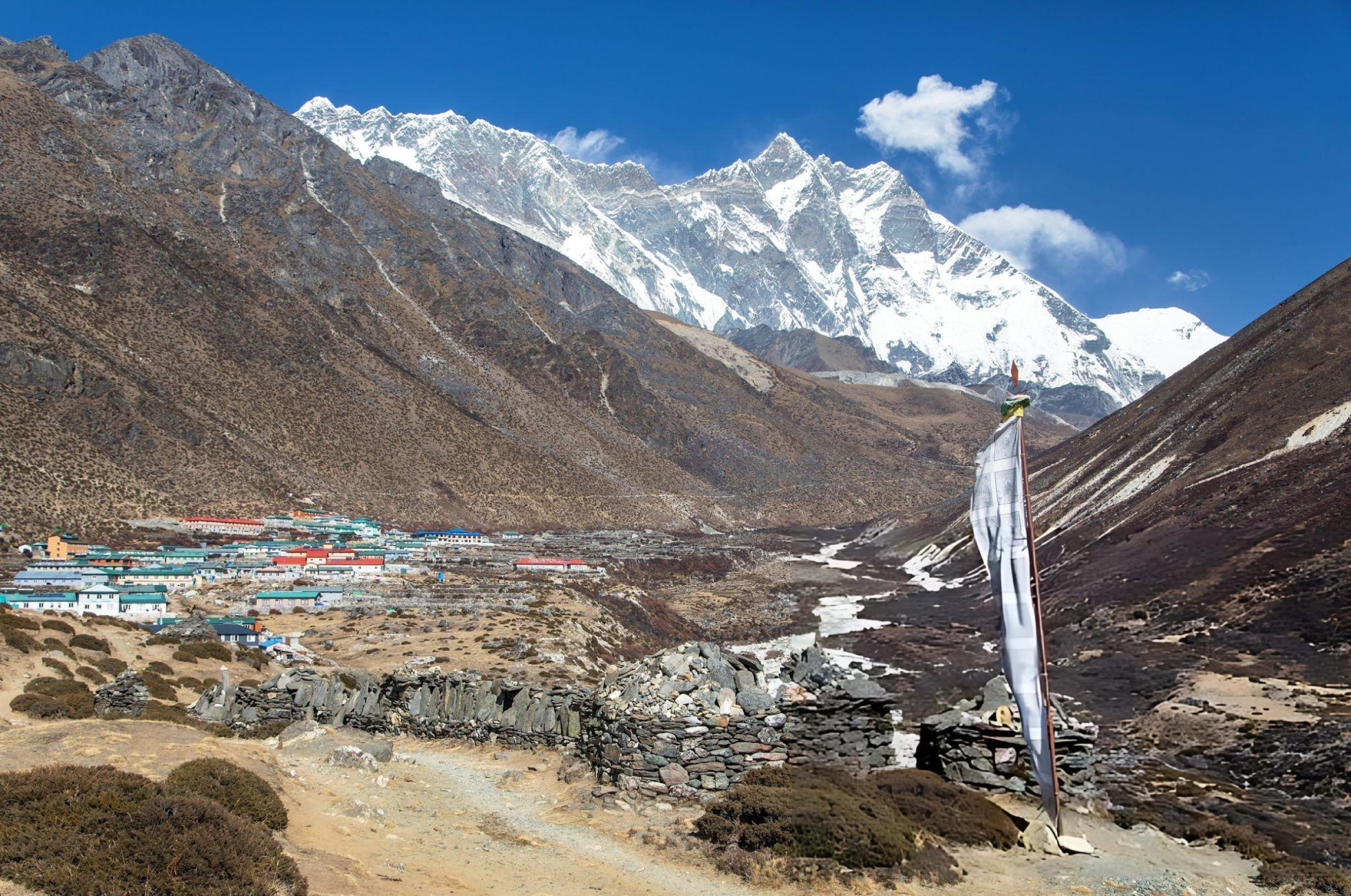 The village sits beside one of the most extraordinary landscapes in the Himalayas: a series of six turquoise glacial lakes, each shimmering at over 4,700 m, fed by the Ngozumpa Glacier (Himalaya’s longest glacier), stretching between 4,700 m and 6,000 m.