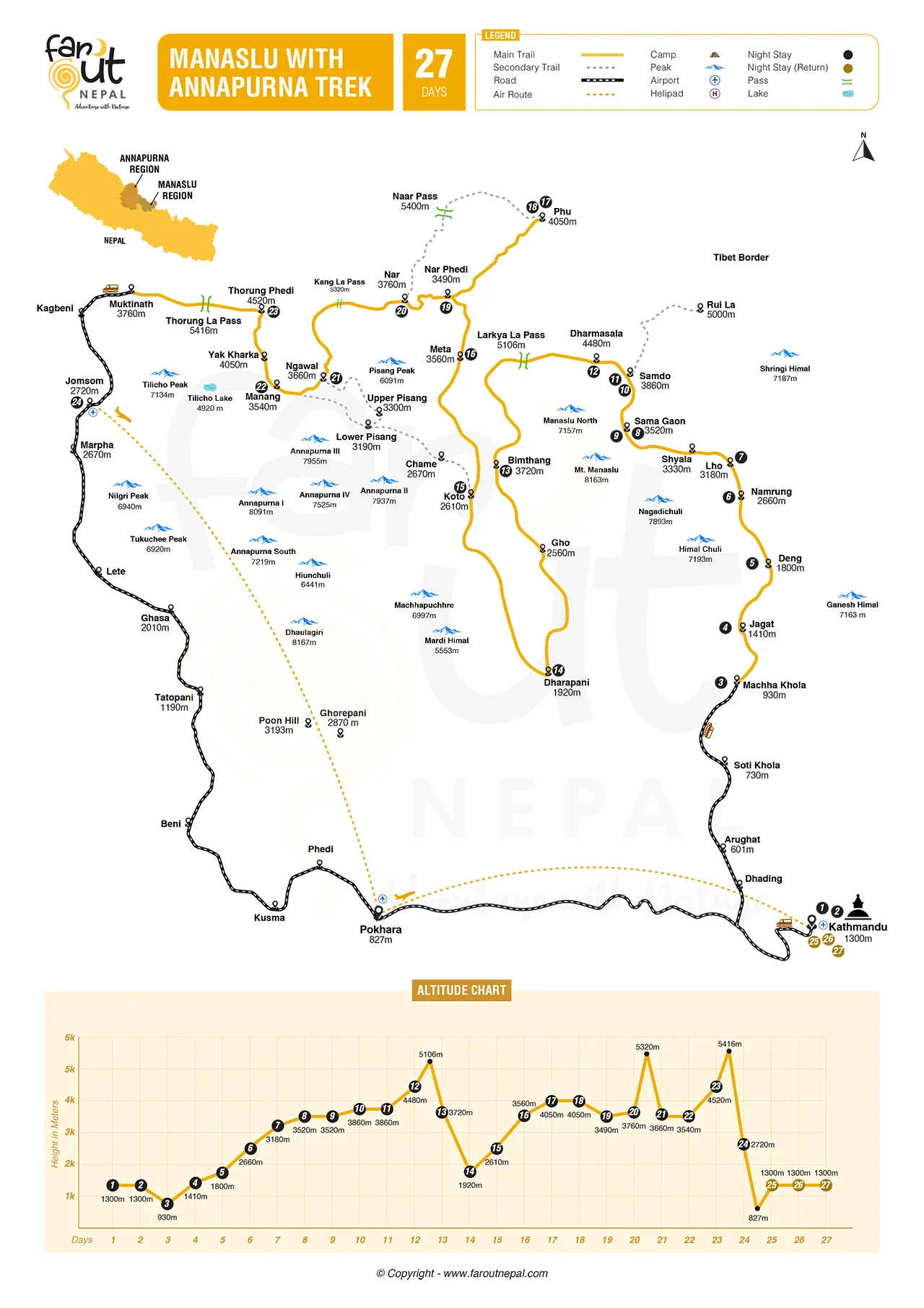 - Manaslu with Annapurna trek is on a high-altitude trail reaching up to 5,416 m which susceptible to altitude problem. This is a real challenge as it can affect anyone depending on an individual from an elevation of 2,500m.